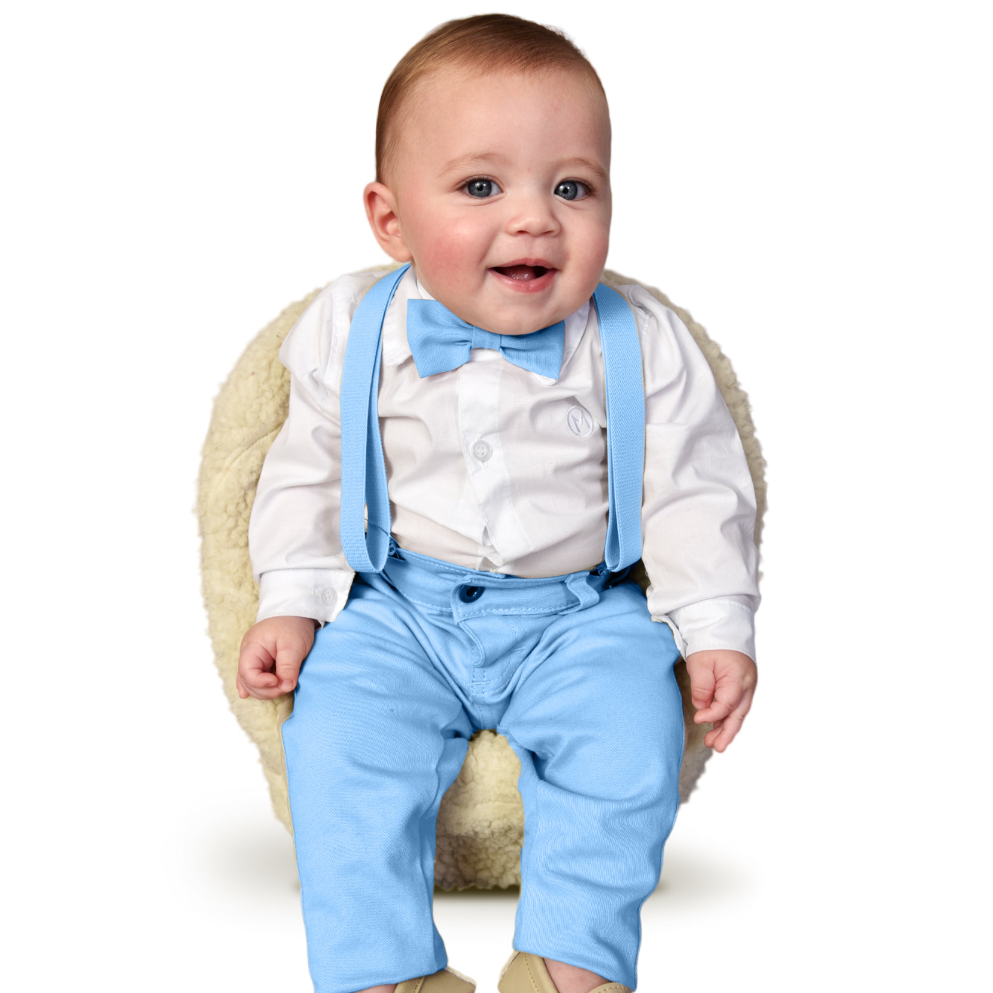 Roupa Social Menino - Bebê ideal para Festas, Batizado, Casamento Acompanha Camisa Social Manga Longa Algodão, Calça com elastano e regulagem interna, Suspensório e Gravata, confeccionados em material de alta qualidade, extremamente confortável.
