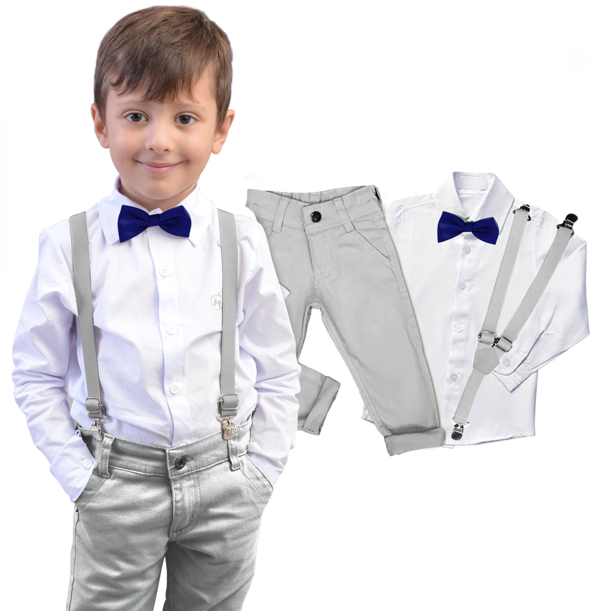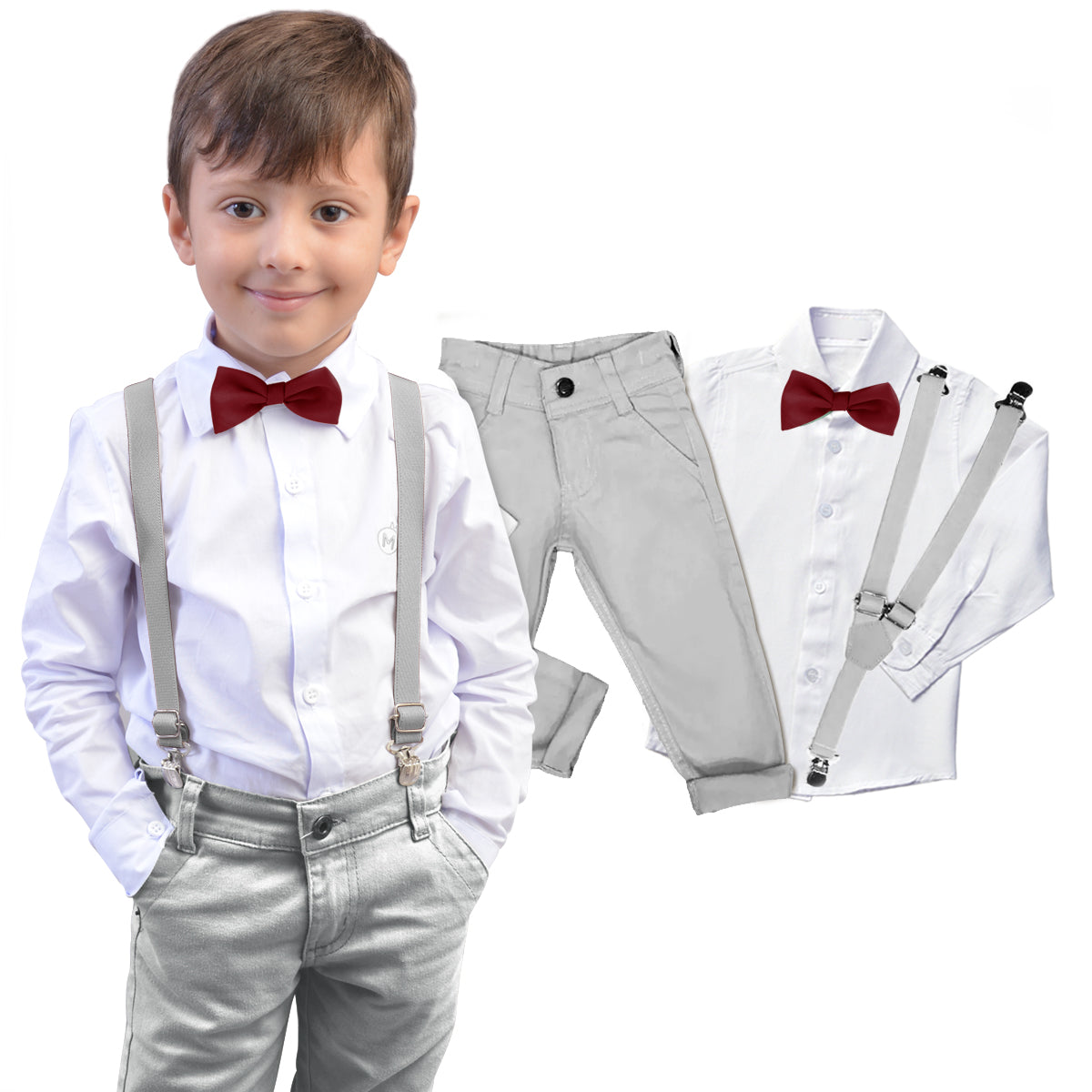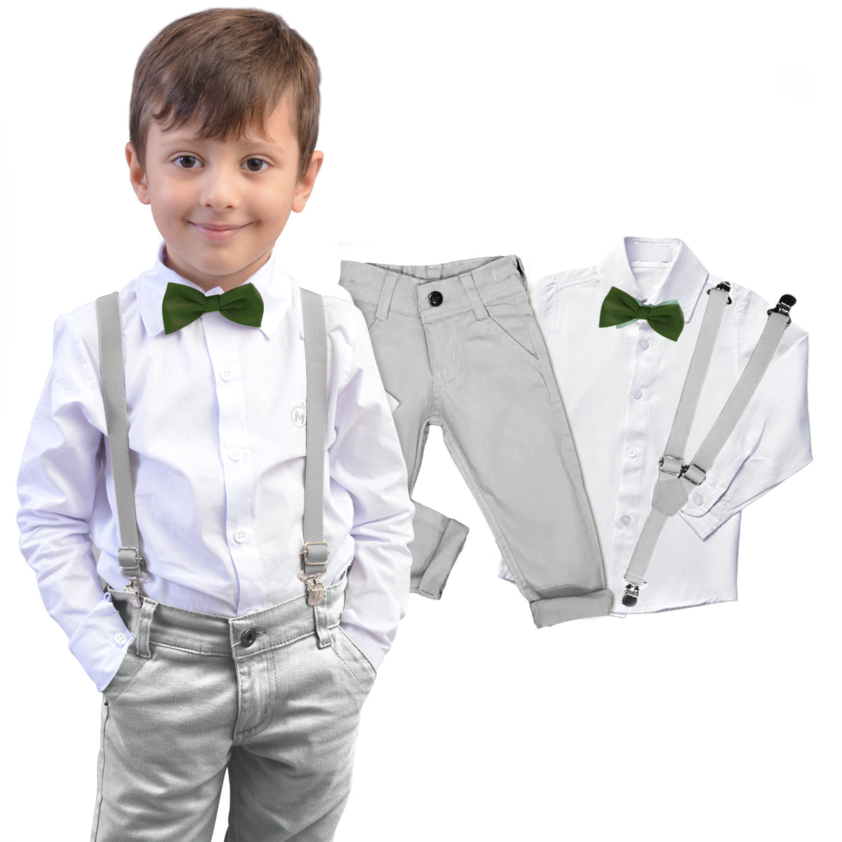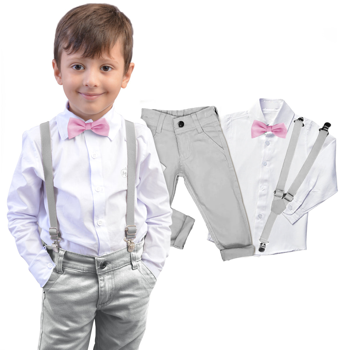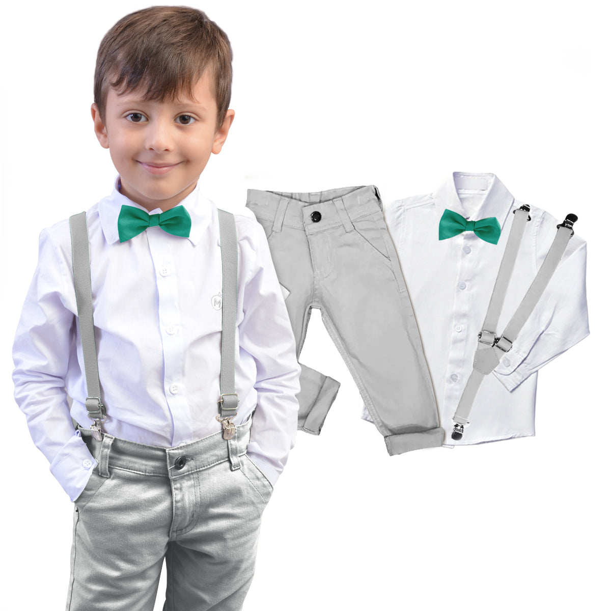 Conjunto Social ideal para Festas, Batizados, Casamentos, Pajem e Formaturas. Acompanha Camisa Social Branca ou Body algodão, calça bege com elastano e regulagem interna, suspensório e gravata bege.