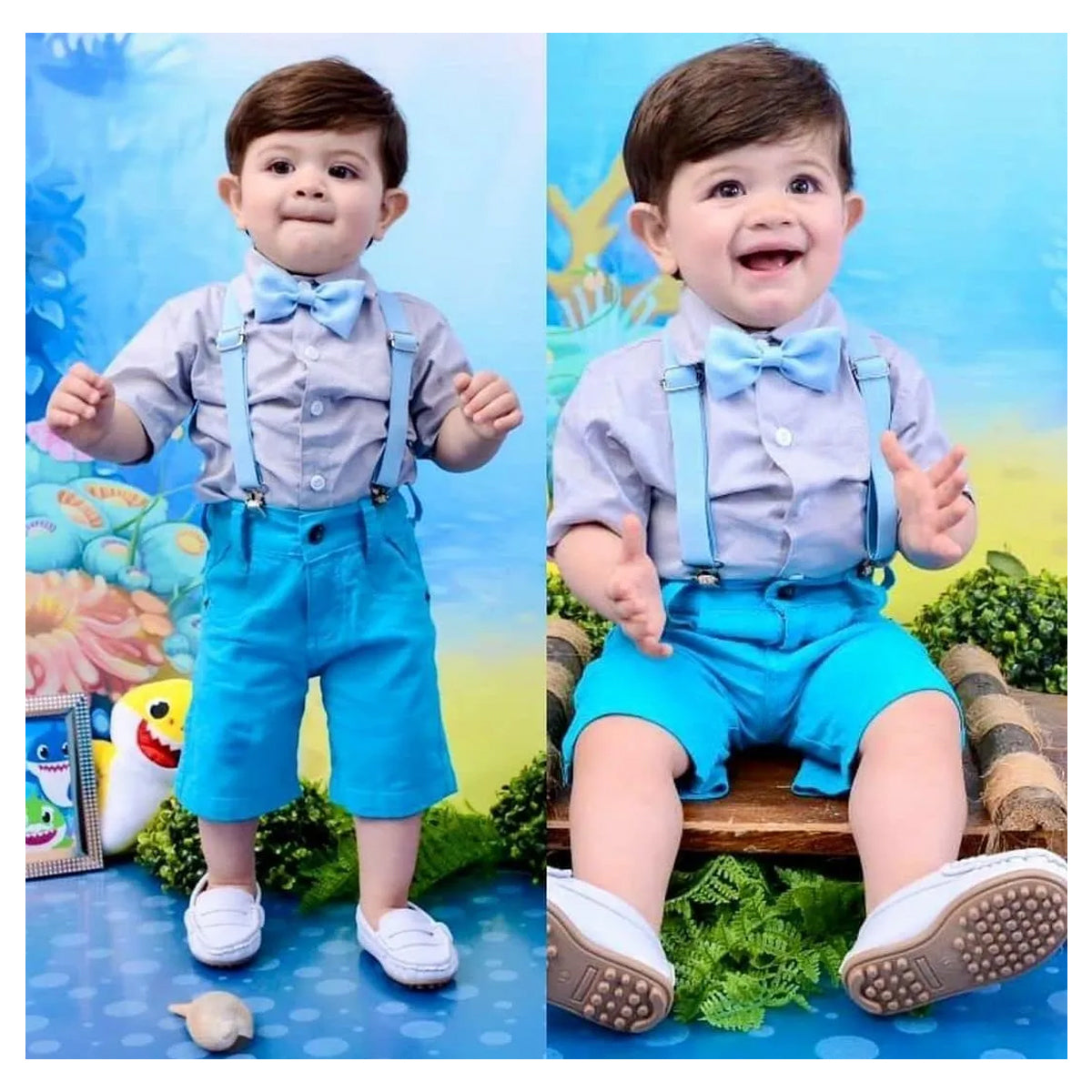 Conjunto Roupa Infantil para menino, bebê social, Ideal para batizados, festas e Casamentos, super estiloso e confortável. Acompanha Camisa Social Bermuda com ajuste interno, Suspensório e Gravata, confeccionados em material de alta qualidade, extremamente confortáveis.