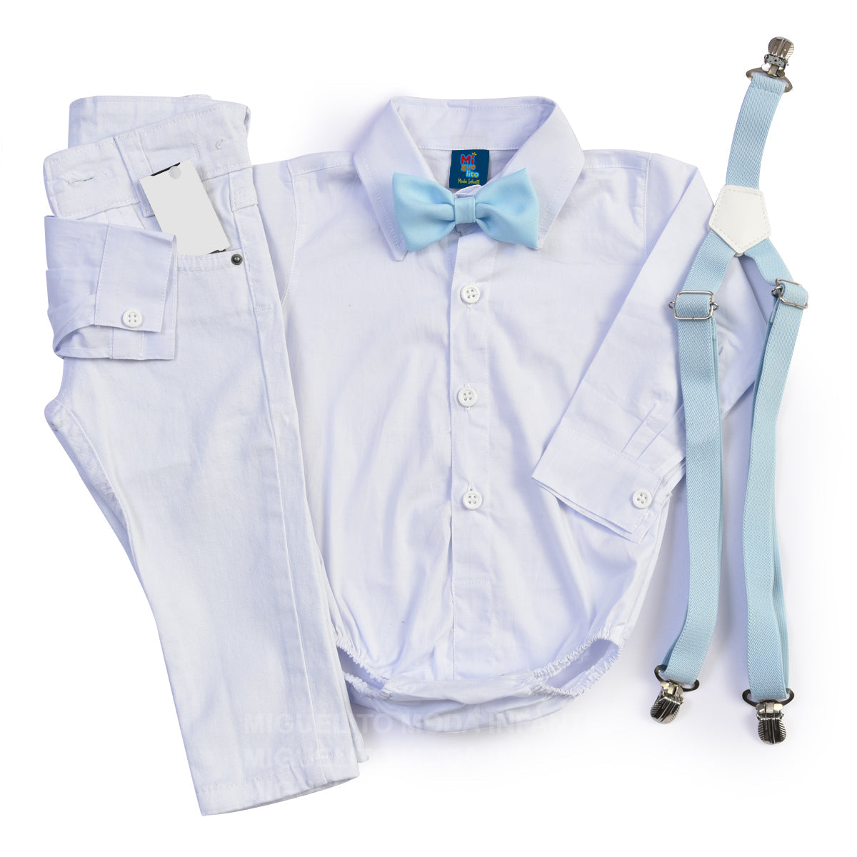 Conjunto Bebê Menino ideal para Batizado, Apresentação e Festa acompanha Body Social Manga Longa Branco de algodão, Calca Jeans Branca com elastano e regulagem interna, Gravata e Suspensório Azul Bebê, confeccionados em material de alta qualidade, extremamente Confortável.