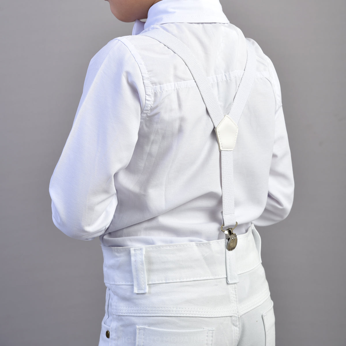 O kit acompanha: Camisa Social Branca Manga Longa, Calça Branca com ajuste interno, Kit gravata e suspensório.