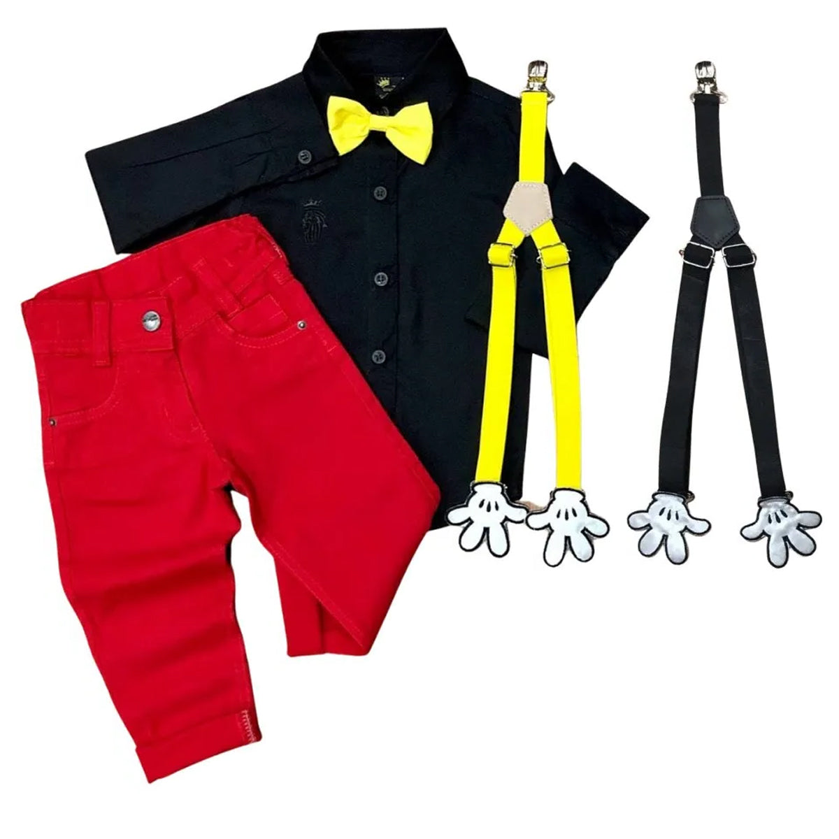 Conjunto Roupa Infantil para menino, Ideal para Festas, Aniversario Super estiloso e confortável. Acompanha Camisa Social Preto, Bermuda Vermelha com elastano e regulagem interna, Sapato Mocassim, Suspensório e Gravata Amarela, confeccionados em material de alta qualidade, extremamente Confortável.